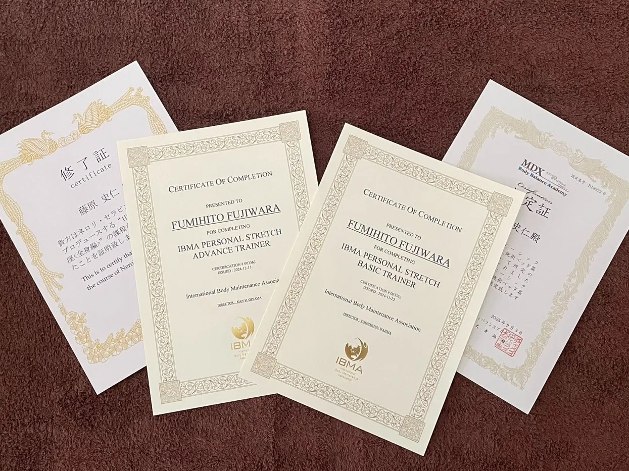 - ストレッチトレーナー(IBMA認定 パーソナルストレッチ ベーシック&アドバンストレーナー):関節の可動域を広げ、体の動きやすさを取り戻します。